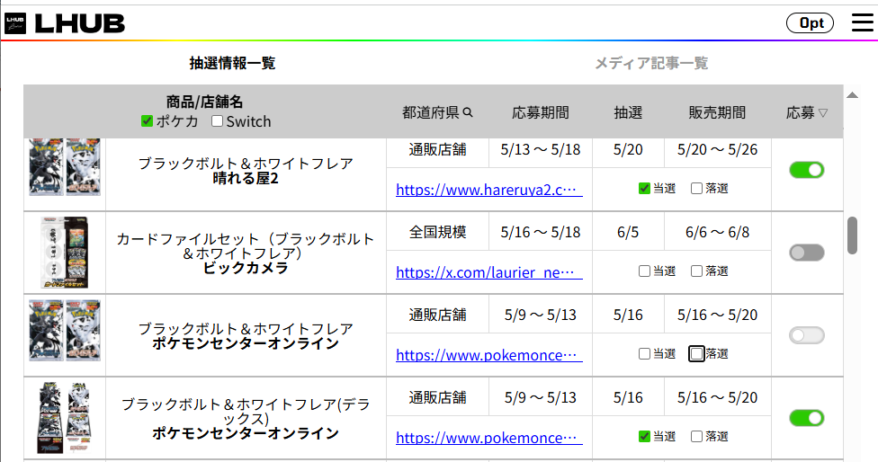 LHUBでは、最新のポケモンカードやSwitch2の抽選URLが随時更新されるだけでなく、応募・当選したかが管理できます!また、メディアも展開しておりLHUBひとつで全てが完結します!全国のポケカファンと繋がってみませんか?LHUBに登録して5月末のコミュニティに参加して、お得な情報とポケモンカードをゲットしよう!