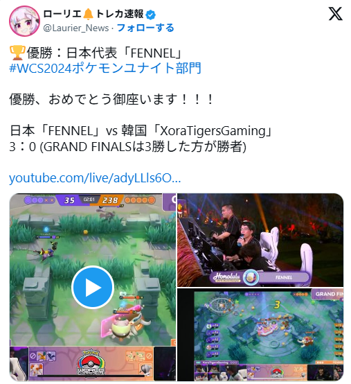 個人的にはポケモンユナイトもプレイしており、日本が優勝した瞬間は噛みしめる喜びでしたっ!https://x.com/Laurier_News/status/1825057503857754371